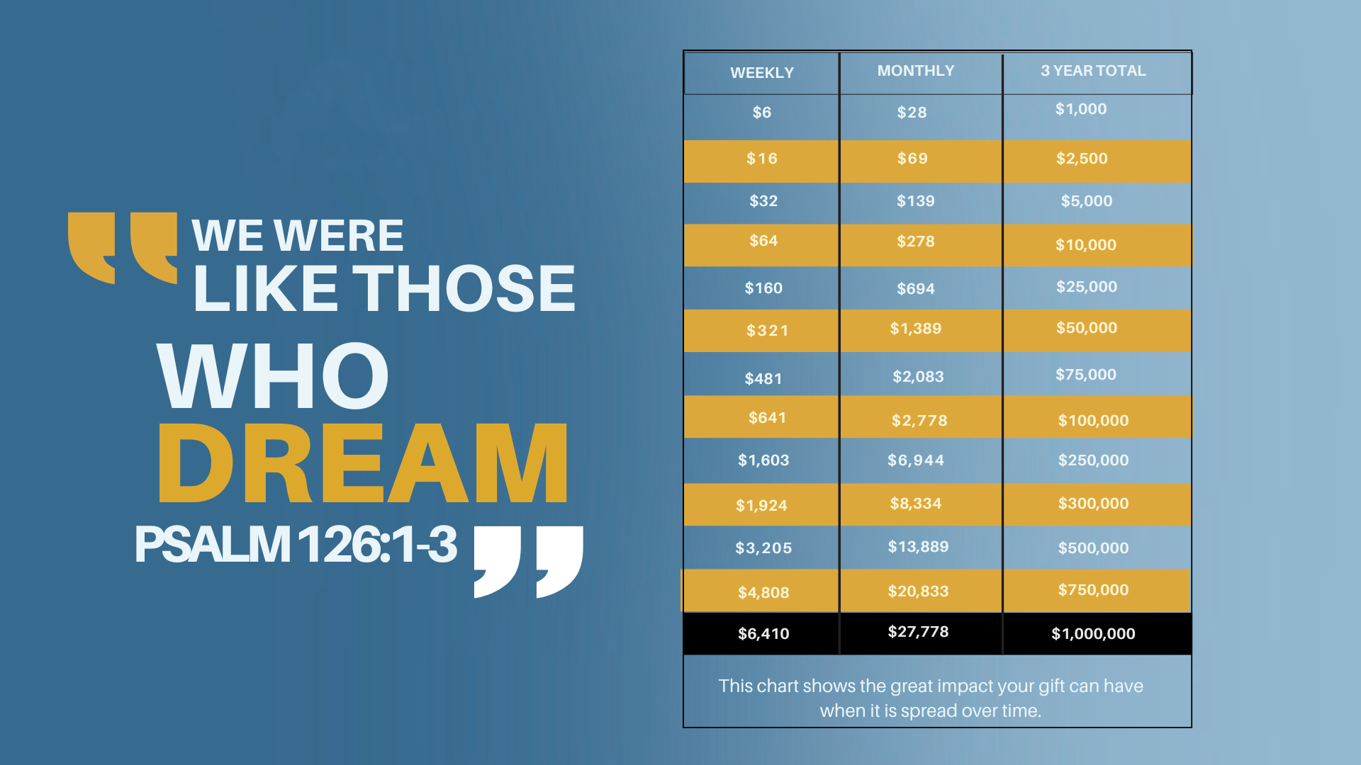 This chart shows the incredible impact your gift can make when it is faithfully given over time.