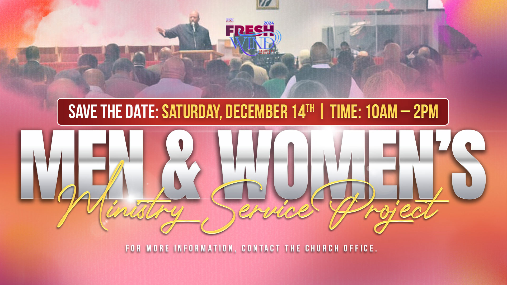 Mark your calendars for Saturday, December 14th, from 10 AM to 2 PM, and join us for a special Men & Women’s Ministry Service Project. This event is an excellent opportunity to serve alongside others, make an impact in our community, and glorify God through meaningful acts of service. For more information, contact the church office.